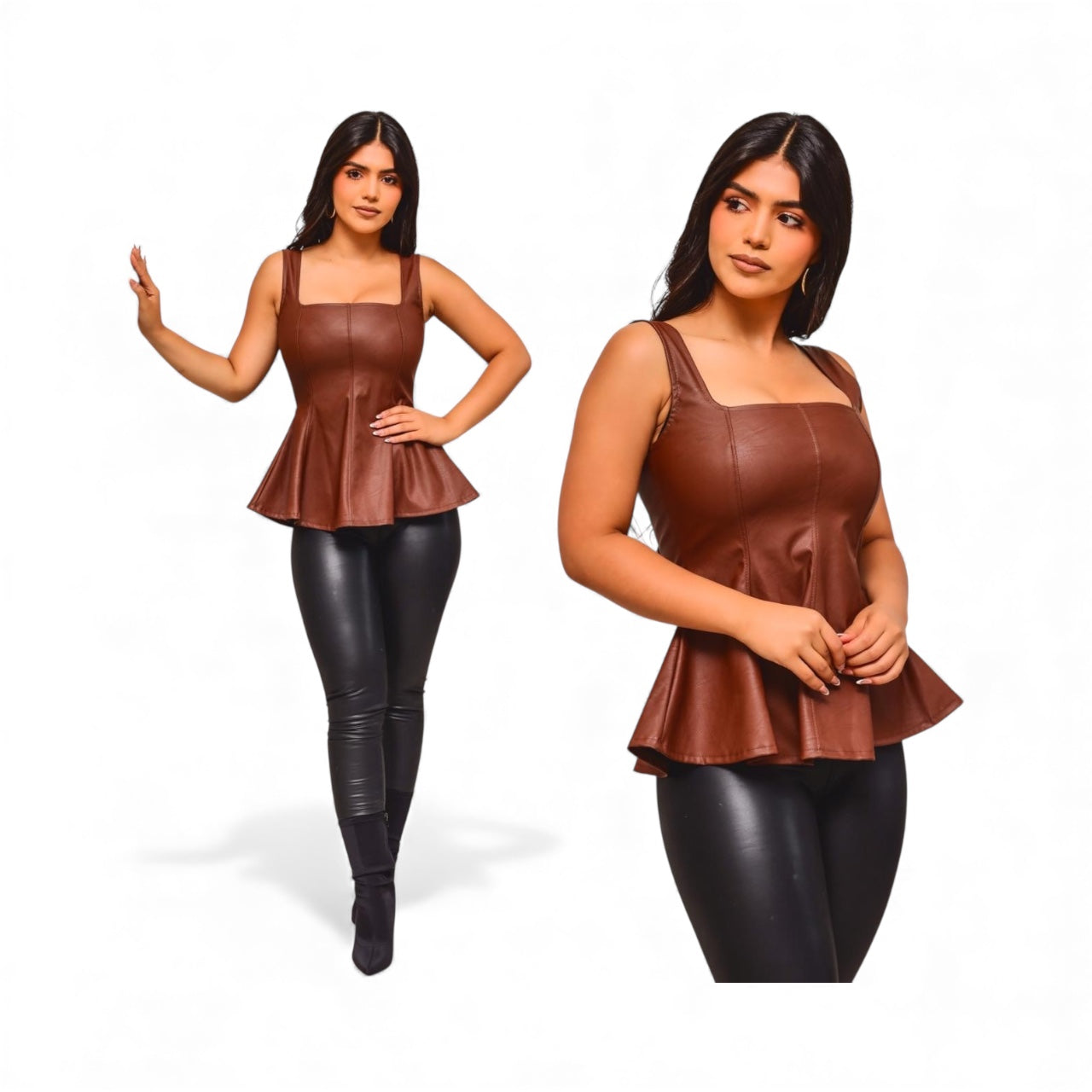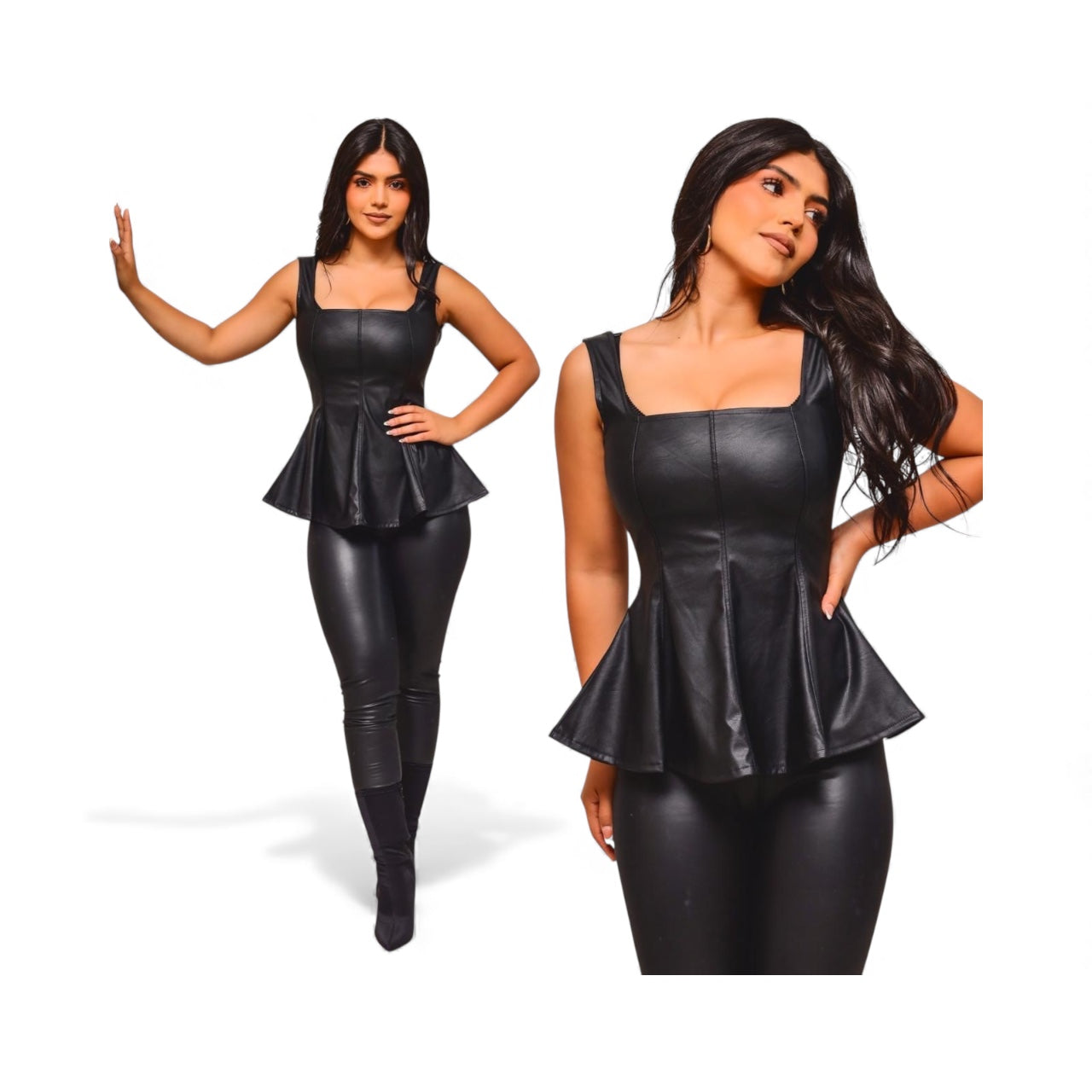 Top estilo peplum confeccionado en polipiel suave (PU) con acabado tipo cuero.