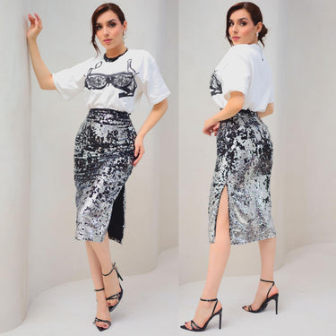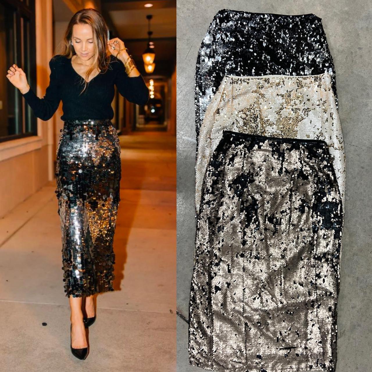 Esta falda midi de lentejuelas estiliza y alarga la figura.Abertura lateral que aporta comodidad y un toque sensual.Pretina alta que define y acentúa la cintura.Forro interior que evita transparencias. Tejido con ligera elasticidad para un mejor ajuste y comodidad