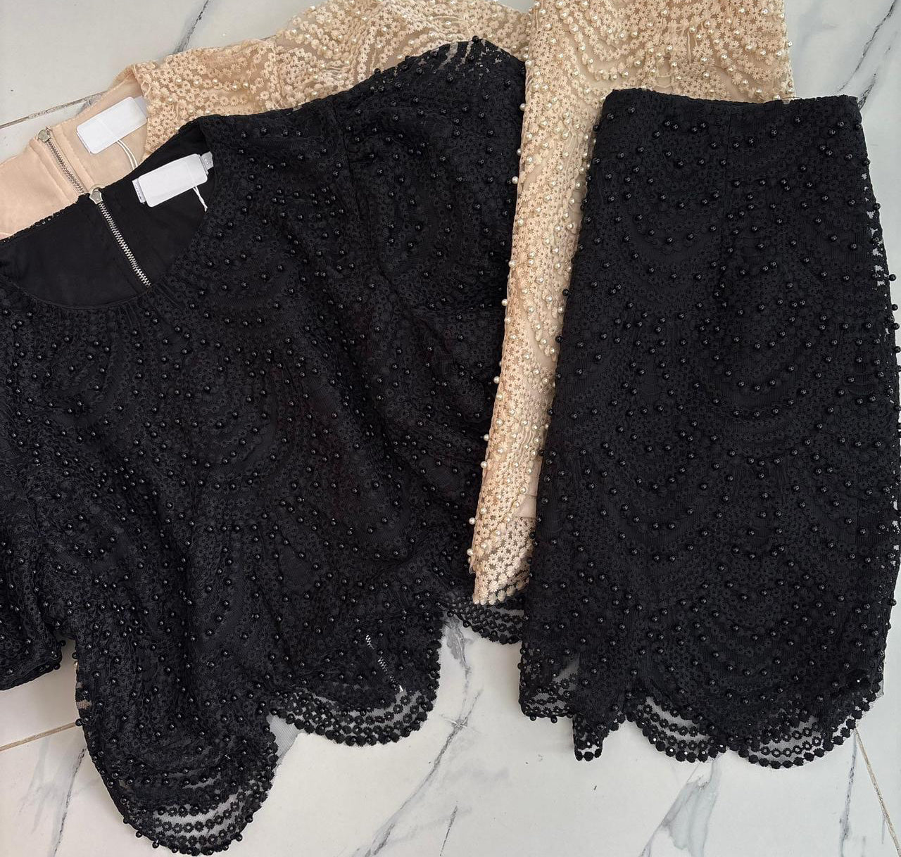 Set compuesto por blusa cropped y falda, confeccionado en encaje fino bordado, con aplicaciones de perlas pequeñas cosidas que aportan brillo sutil y sofisticado.