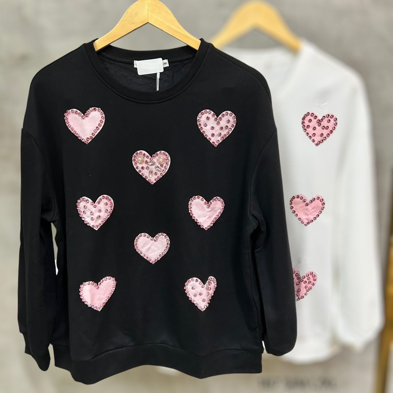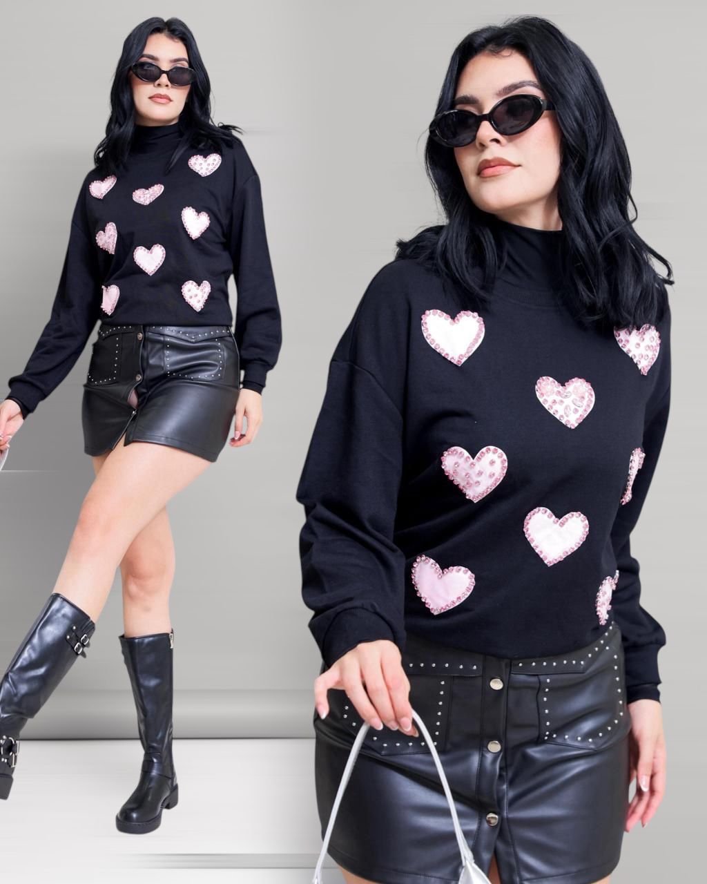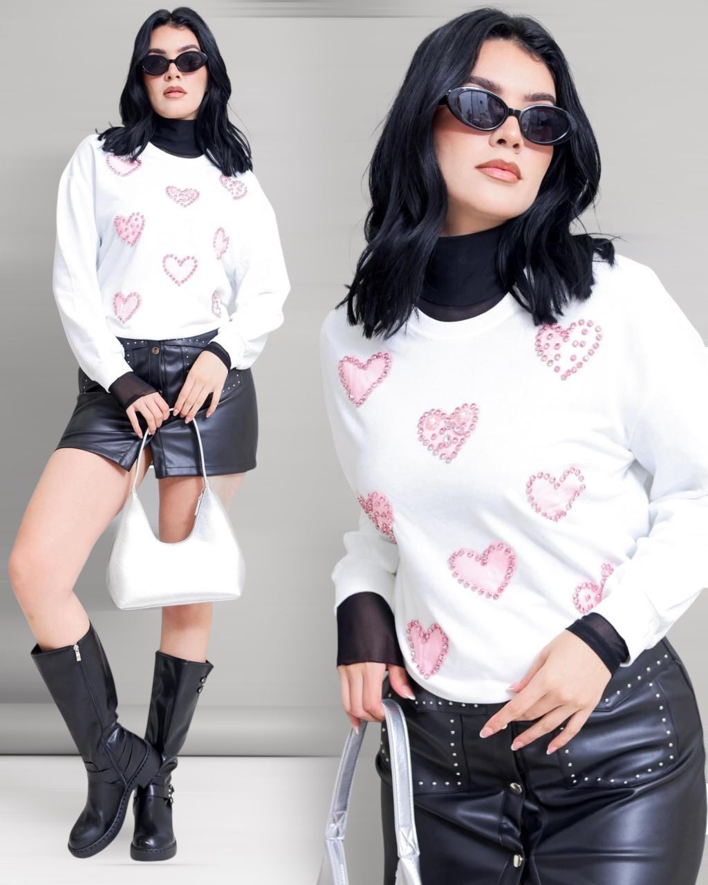 SUÉTER CON CORAZONES EN TRANSFER Y APLICACIÓN DE PEDRERÍA