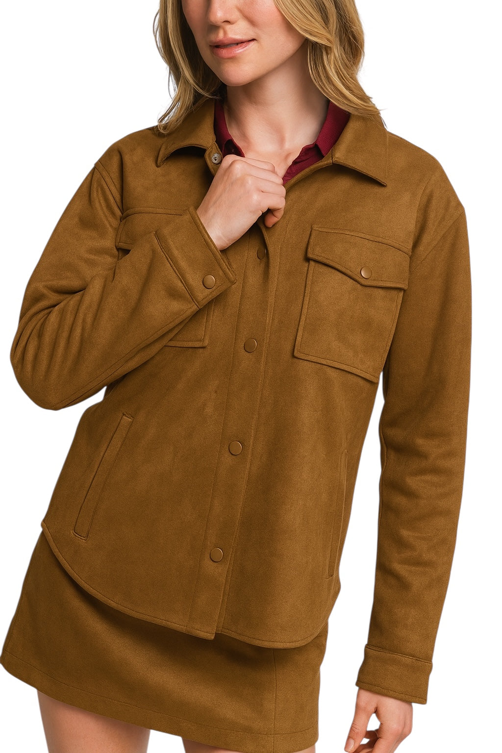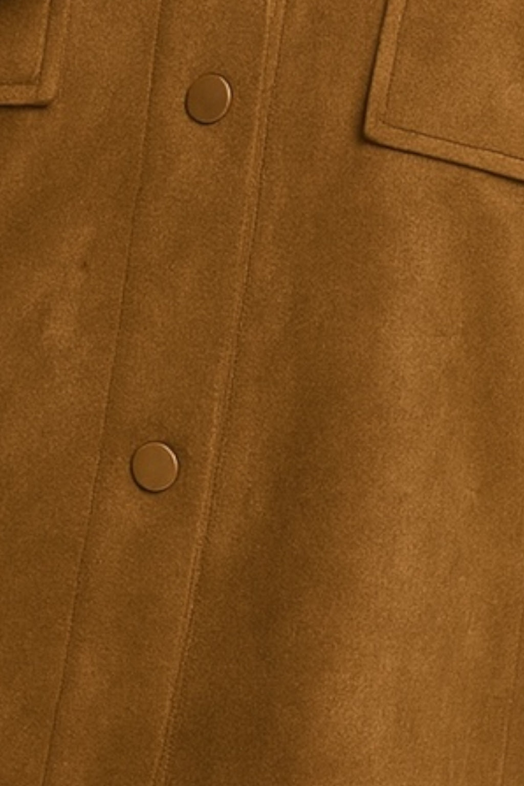 Diseño tipo camisa con bolsillos frontales con solapa y botones de presión, ideal para usar abierta o cerrada.Confeccionada en tela antelina, de tacto aterciopelado y acabado elegante.Disponible en colores camel, café, crema y negro, tonos neutros perfectos para combinar con jeans, pantalones o faldas de temporada.