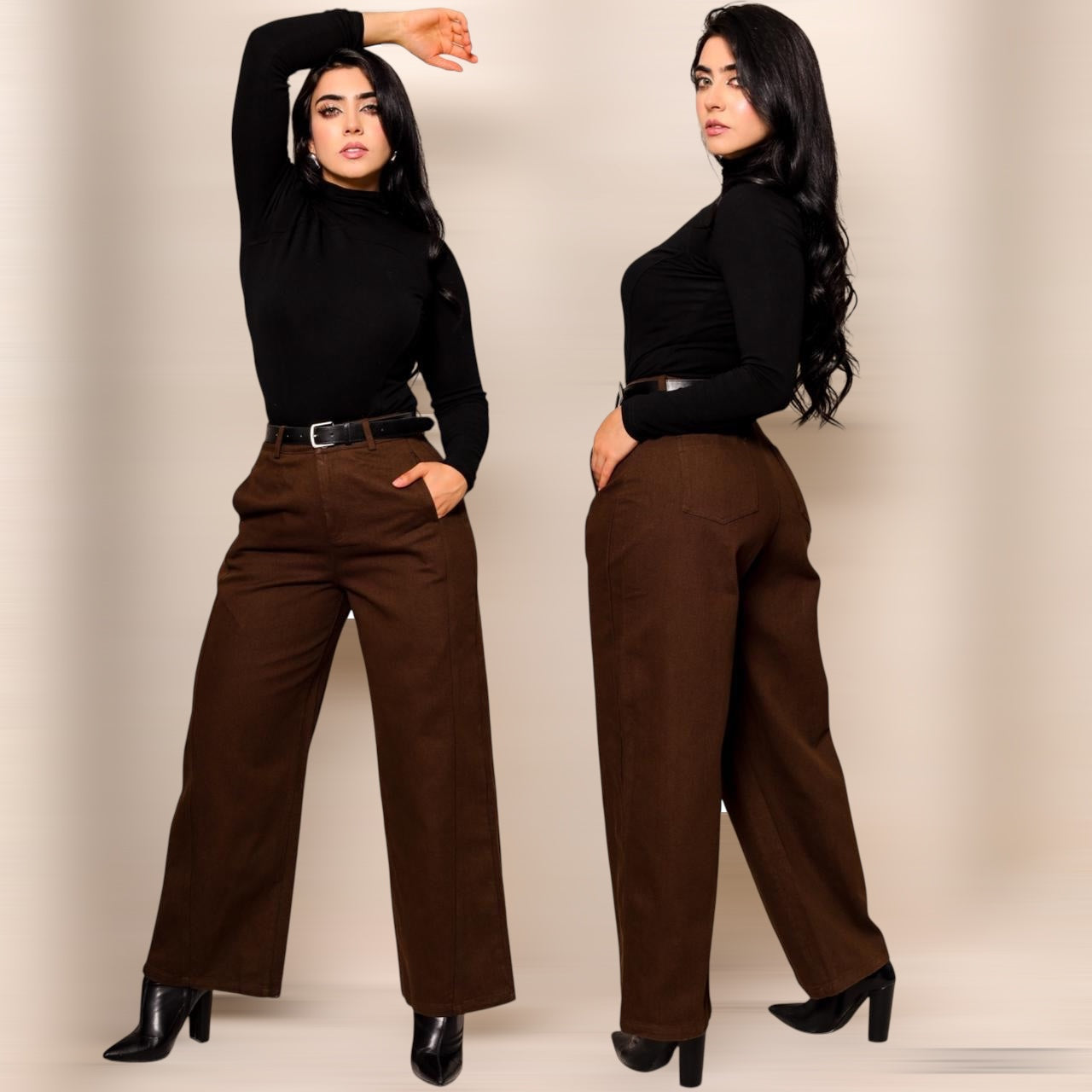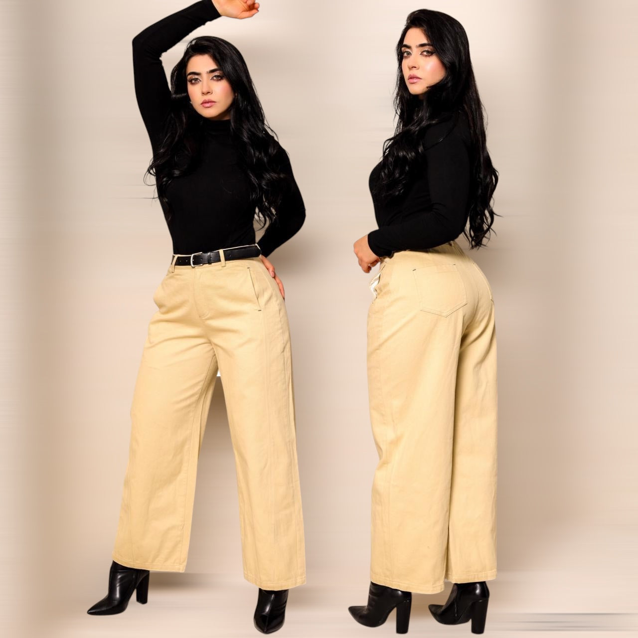 Pantalón confeccionado en tela twill, material similar a la mezclilla pero más ligero y flexible.Diseño de tiro alto con pretina para cinturón, bolsillos delanteros y traseros funcionales, y cierre frontal con cremallera y botón.Corte recto ancho con buena estructura y caída natural.