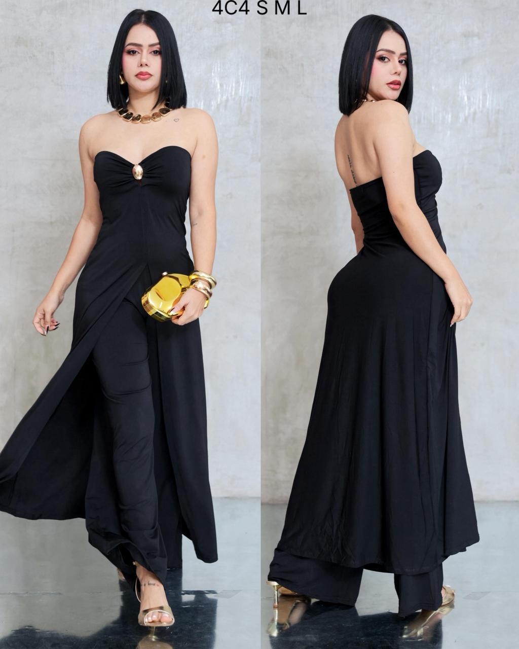 Incluye pantalón amplio integrado bajo una capa superpuesta tipo falda abierta al frente, lo que permite movimiento y genera un efecto elegante al caminar.