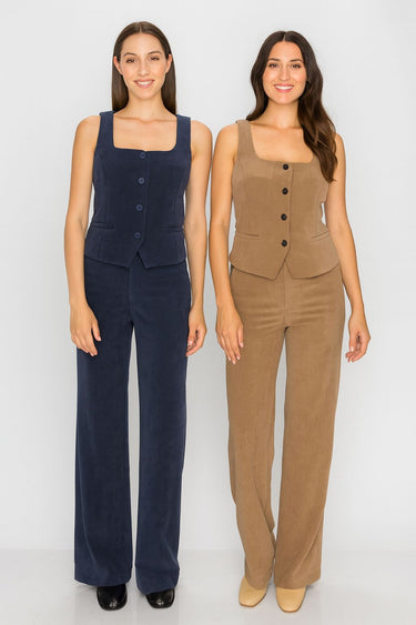 Conjunto confeccionado en tejido de punto estructurado con textura acanalada, suave al tacto y con elasticidad media que brinda comodidad y realce a la silueta.El chaleco presenta un diseño entallado con escote redondeado y cierre frontal con botones forrados, que aporta un aire moderno y sofisticado. Incluye bolsillos tipo ojal decorativos que estilizan la figura.