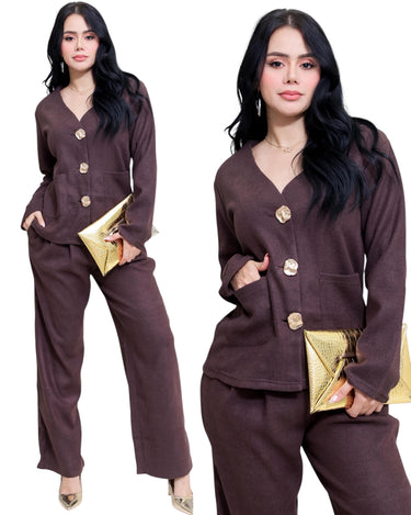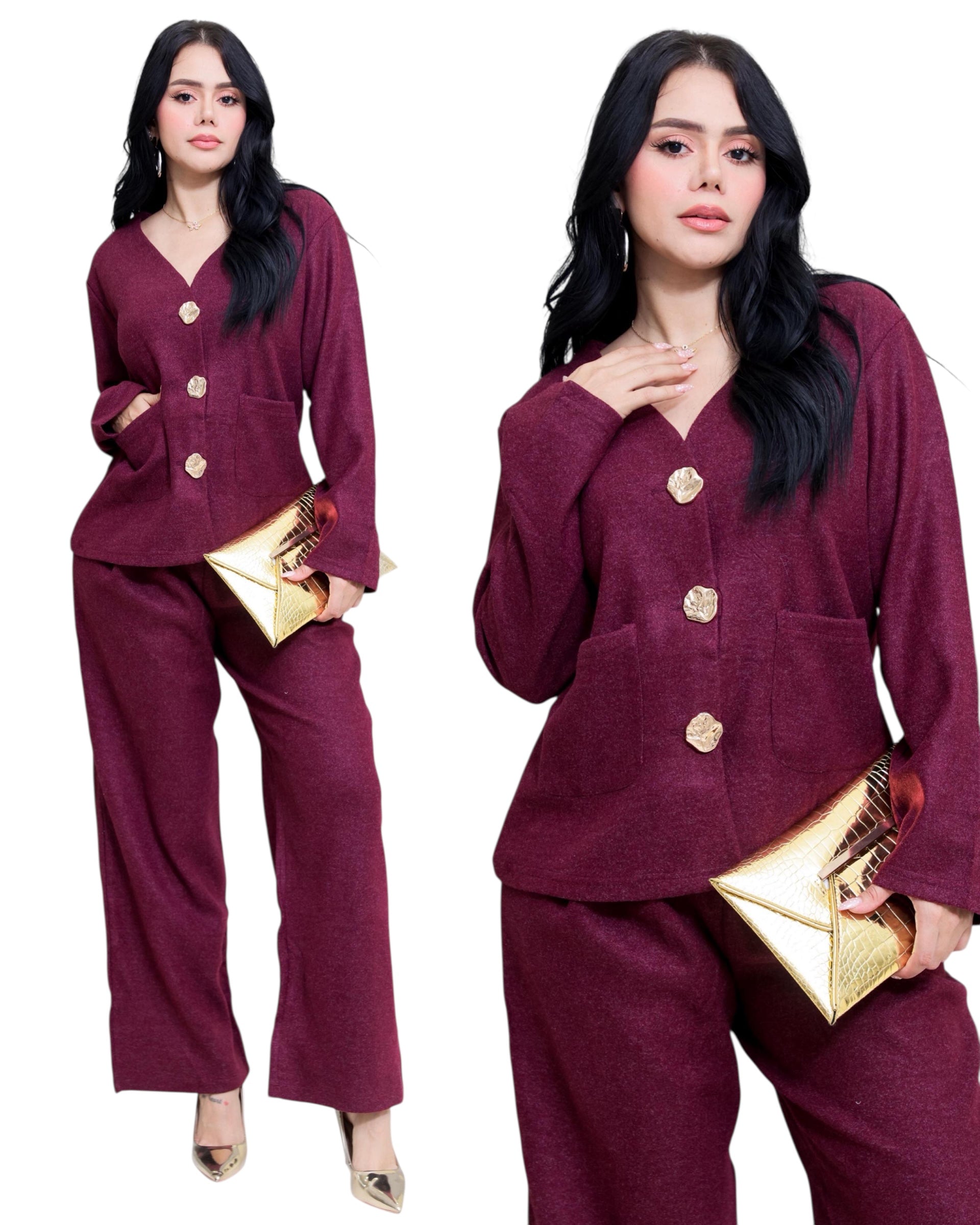La blusa tipo saco destaca por su escote en V, bolsillos frontales funcionales y botones dorados texturizados, que aportan un toque sofisticado y moderno.El pantalón de tiro alto y corte recto realza la figura