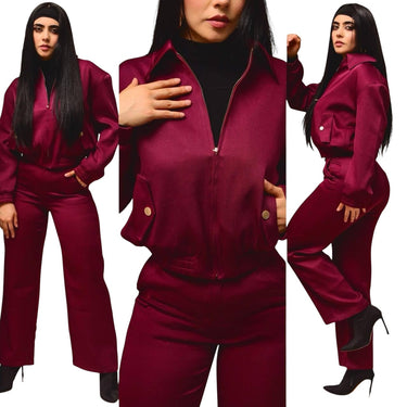 La chaqueta cuenta con cierre metálico dorado y bolsillos funcionales, mientras que el pantalón ofrece confort y caída fluida.