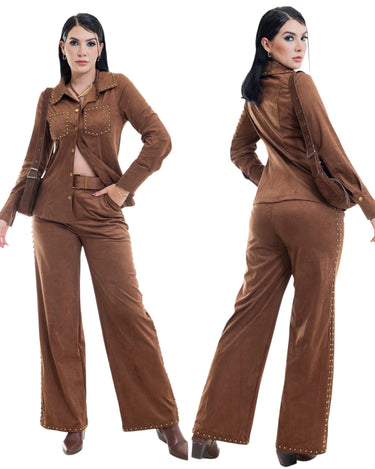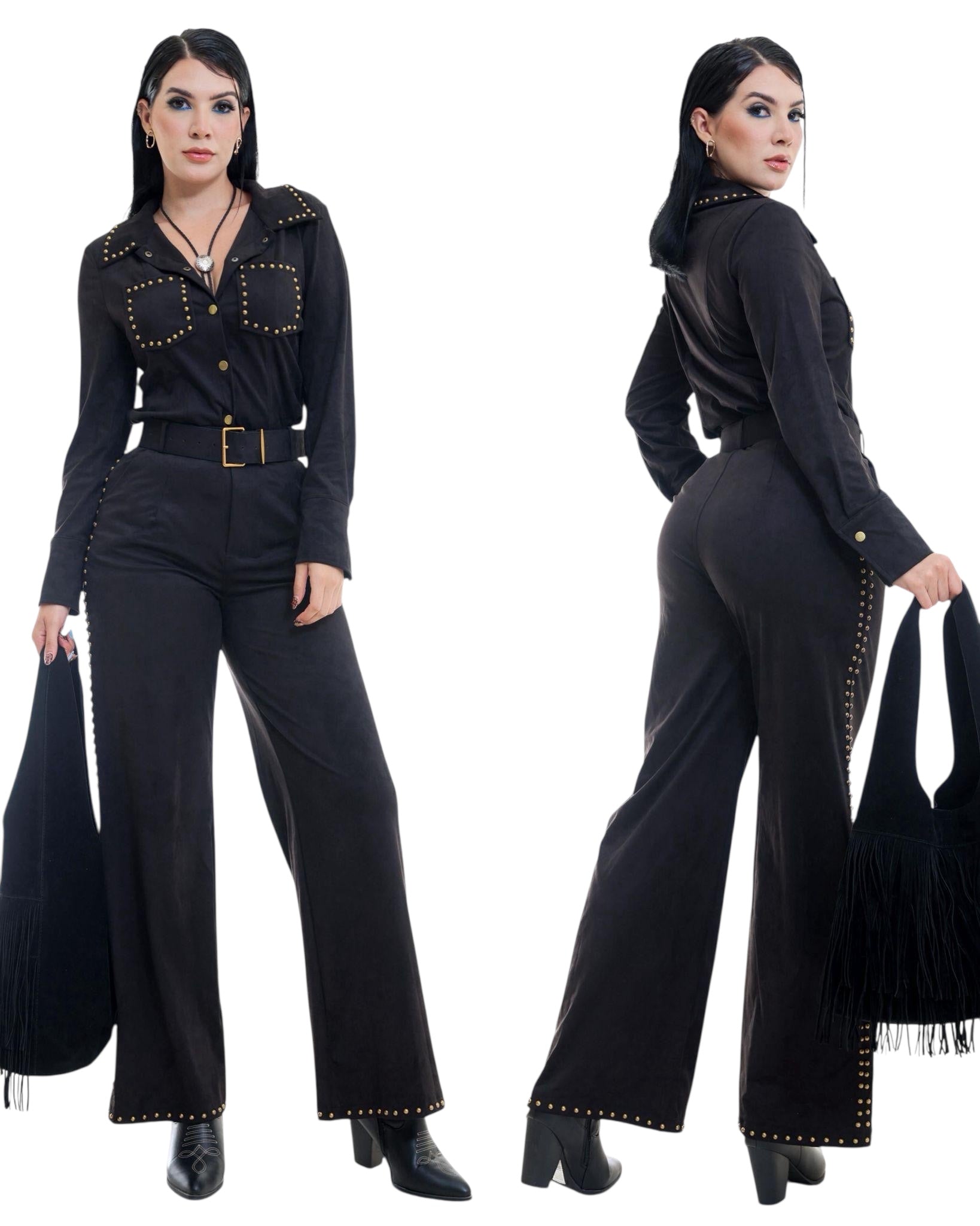 El pantalón de corte recto con caída fluida estiliza la silueta; cuenta con basta decorada con apliques metálicos y cinturón al tono con hebilla dorada.Un conjunto versátil, ideal para crear looks de inspiración western-chic o urbana