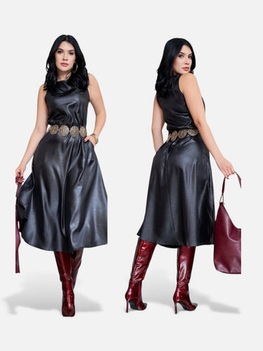 Vestido de tela encerada sin mangas, con acabado satinado y suave que imita el efecto del cuero pero con una caída mucho más ligera y fluida.
