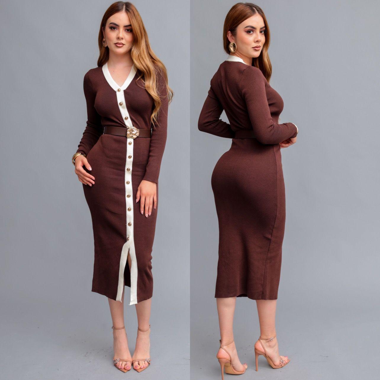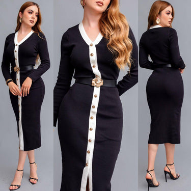 Vestido midi en tejido de punto elástico, elegante y femenino.Escote en “V” con contraste en color blanco.Botonadura frontal dorada que estiliza la silueta.Con un inturón negro con hebilla floral que realza la cintura.Corte ajustado que resalta la figura con comodidad.Su Largo midi versátil, ideal para ocasiones formales o casual