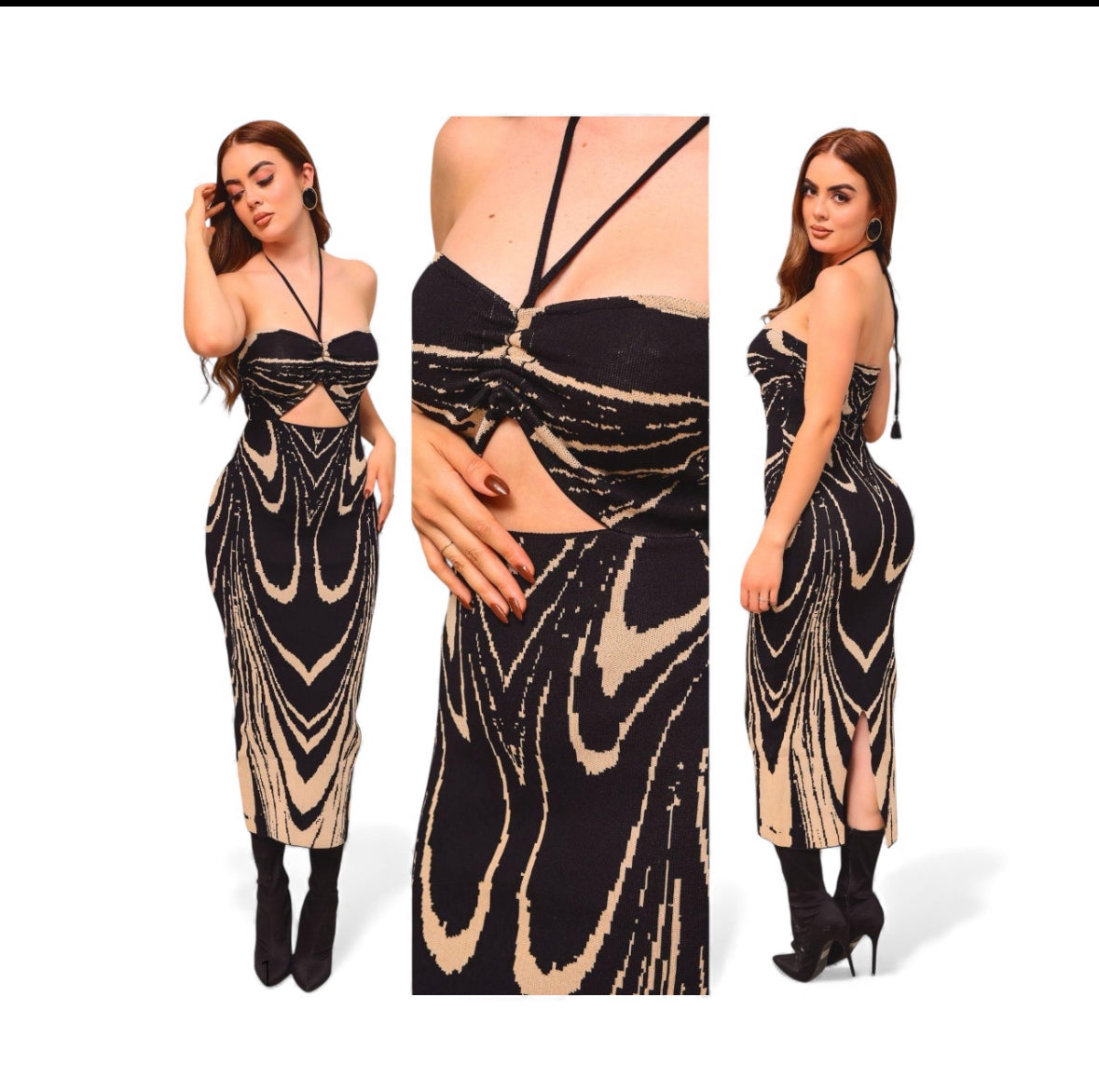 Cuenta con escote halter con tiras delgadas, busto fruncido y abertura frontal tipo cut-out que añade un toque sensual sin perder la elegancia.