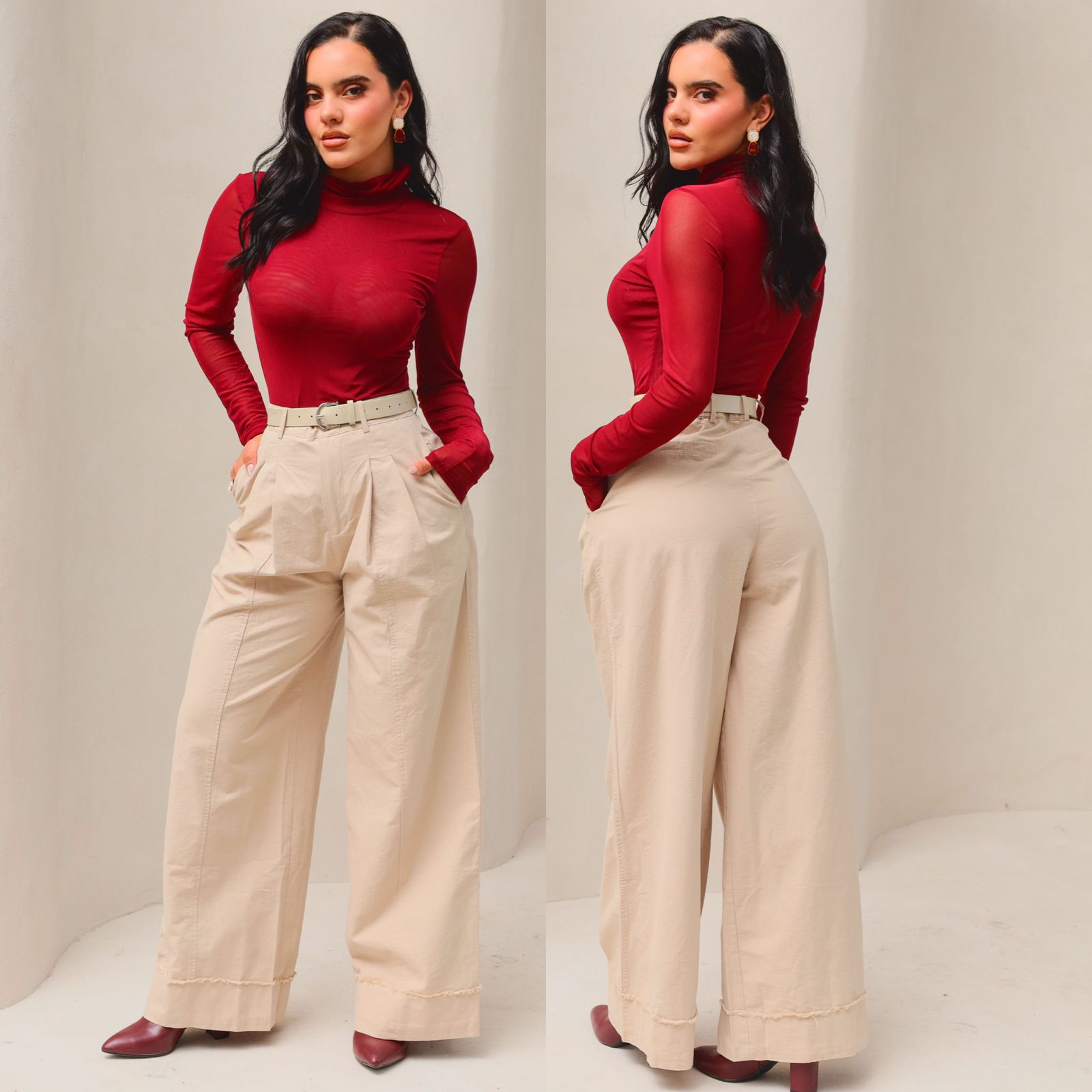 Pantalón de tiro alto wide leg recto, confeccionado en sarga 100% algodón, resistente y transpirable.